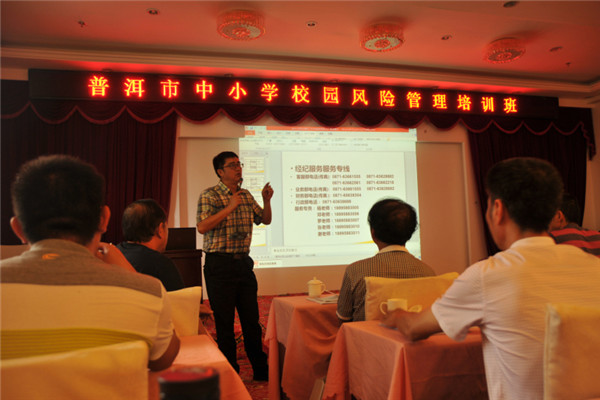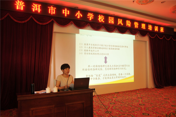 為認(rèn)真貫徹落實(shí)《云南省教育廳關(guān)于舉辦中小學(xué)校園風(fēng)險(xiǎn)管理培訓(xùn)班的通知》(云教函[2015]317號(hào))文件精神,進(jìn)一步加強(qiáng)普洱市學(xué)校安全教育和管理工作,切實(shí)提高基層學(xué)校風(fēng)險(xiǎn)防控的能力,于2015年8月25日舉辦了義務(wù)教育階段學(xué)校校園風(fēng)險(xiǎn)管理培訓(xùn)班。我公司特邀請(qǐng)專業(yè)律師和保險(xiǎn)專家,組成培訓(xùn)小組,對(duì)參訓(xùn)人員進(jìn)行了培訓(xùn)。專業(yè)律師和保險(xiǎn)專家圍繞依法治校、安全管理方法、法律風(fēng)險(xiǎn)規(guī)避方法、教育風(fēng)險(xiǎn)及風(fēng)險(xiǎn)管理辦法、保險(xiǎn)法等內(nèi)容展開了詳細(xì)的講解。我公司業(yè)務(wù)總監(jiān)羅琳對(duì)2014學(xué)年受理的校方責(zé)任保險(xiǎn)案例作了詳盡的分析,并提出了相關(guān)風(fēng)險(xiǎn)管理建議。她指出,我省校園安全責(zé)任事故類型主要以意外傷害事故為主,因此加強(qiáng)安全與防范教育以及校園課間管理尤為重要?头苦嚂喳愒敿(xì)解釋了《云南省教育廳等四部門關(guān)于加強(qiáng)學(xué)校保險(xiǎn)工作的指導(dǎo)意見》(云教體[2014]26號(hào))中所列的險(xiǎn)種,并提出了相關(guān)建議。