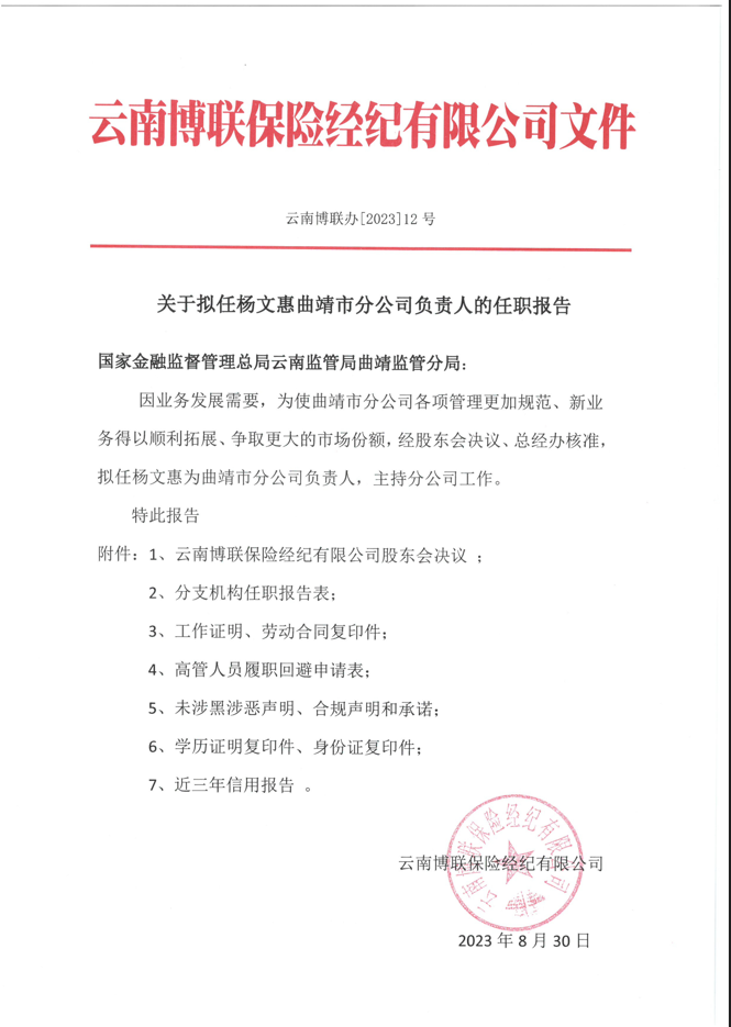 關于擬任楊文惠曲靖市分公司負責人的任職報告